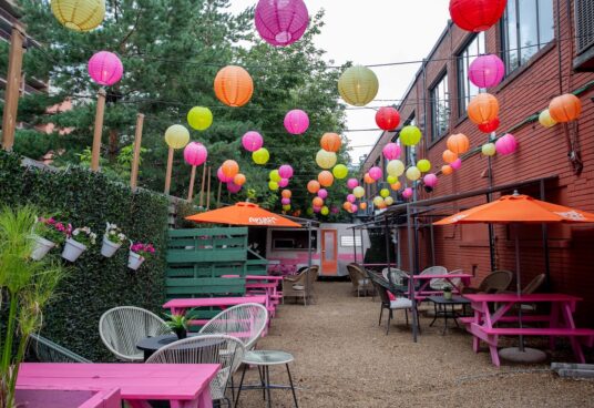 One of the more colourful downtown patios you’ll find in Edmonton, the long backyard of Dolly’s Cocktail Bar is a pink paradise filled with Chinese lanterns and hanging flowers. The other side of the fence that separates it from the neighborhood of Wîhkwêntôwin is against the trolley tracks, so if you close your eyes while sipping one of the restaurant’s house cocktails you can imagine yourself on a boozy adventure into unknown lands.