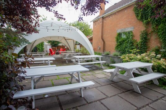 A building with a lot of history behind it, Riverdale’s Little Brick has been around since 1903. Originally the home of businessman J.B. Little, the house has now been converted into a cafe, general store, and multi-use space with one of the larger outdoor patios in the city. Set in a large grassy backyard, overlooked by neighboring houses, Little Brick has picnic tables, a large canopy, and greenery spreading over the brick edifice.